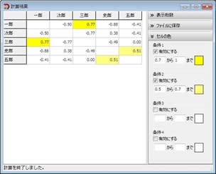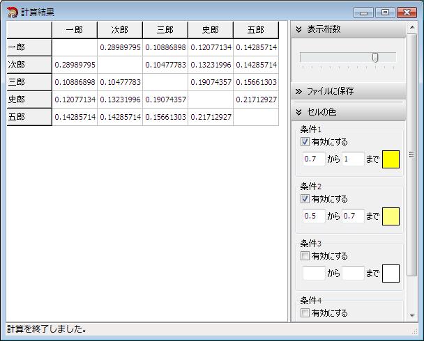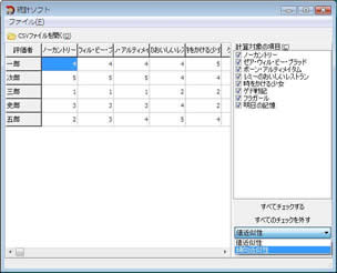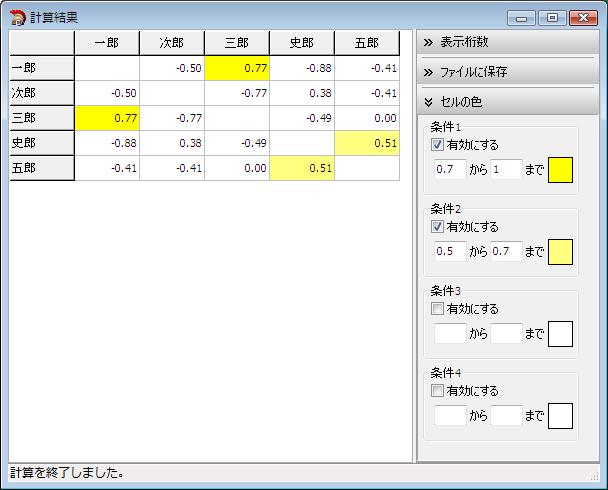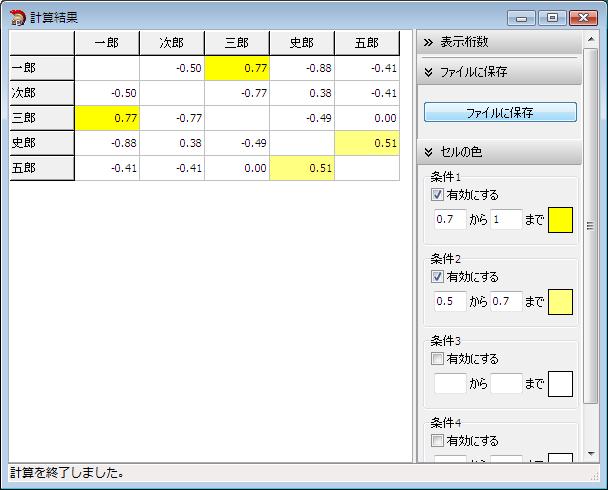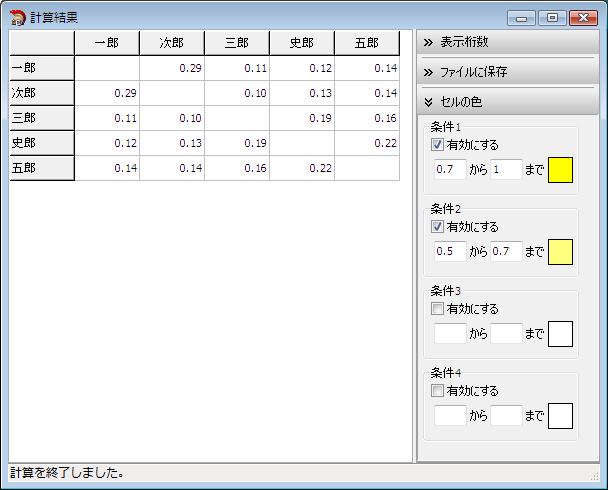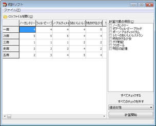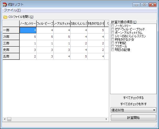 例えば、すべての計算対象項目をチェックして「傾向近似性」を計算した場合、 一郎と三郎は、洋画よりも邦画の方に高い点を付けているため、「傾向近似性」の結果が高い数値になります。
