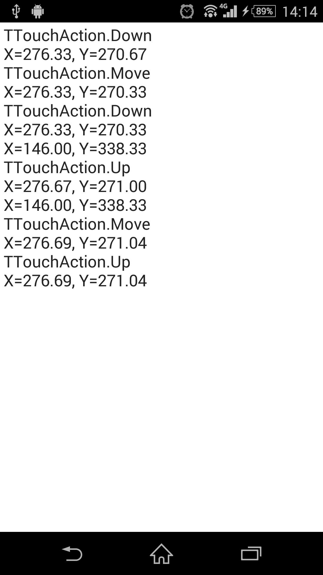 Memo1.Lines.Add(Format('X=%f, Y=%f', [Touch.Location.X, Touch.Location.Y]));