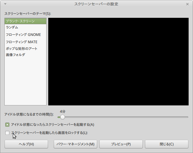 LinuxMintで画面をロックしないように設定をする 作者: 山本 隆 2016年8月4日 8:45 パソコンを一定時間使用しないと、画面がロックされ、ロックを解除するためにパスワードを入力することになります。 Linux Mint 17.3で画面をロックしないようにするには、次の手順で設定します。 「メニュー」→「設定」→「スクリーンセーバー」を選択します。 「スクリーンセーバーを起動したら画面をロックする」のチェックを外します。 共有: クリックして X で共有 (新しいウィンドウで開きます) X Facebook で共有するにはクリックしてください (新しいウィンドウで開きます) Facebook クリックして Tumblr で共有 (新しいウィンドウで開きます) Tumblr クリックして Pocket でシェア (新しいウィンドウで開きます) Pocket その他 クリックして印刷 (新しいウィンドウで開きます) 印刷 クリックして友達にメールでリンクを送信 (新しいウィンドウで開きます) メールアドレス クリックして Pinterest で共有 (新しいウィンドウで開きます) Pinterest クリックして LinkedIn で共有 (新しいウィンドウで開きます) LinkedIn 関連記事: XAMPP for Windows の Apache が起動しない Emacs のウインドウ下の ATOK 表示を消したい(Vine Linux 3.2) Vine Linux3.1ネットワークインストール覚書 Linux Mint 17.3でゴミ箱を表示するには Debian(sarge)にvmware-toolsをインストール